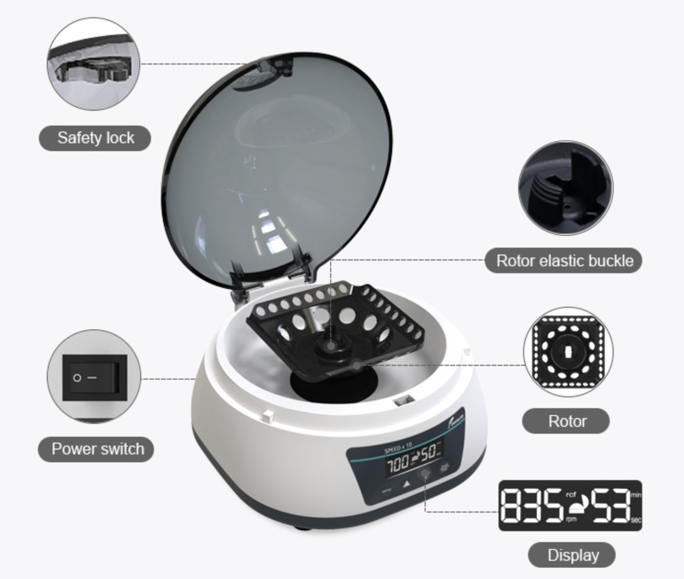 - Multi Rotor: 12 vị trí x ống 0.2ml/0.5ml/1.5ml/2ml + 4 dải PCR (8x0.2ml)