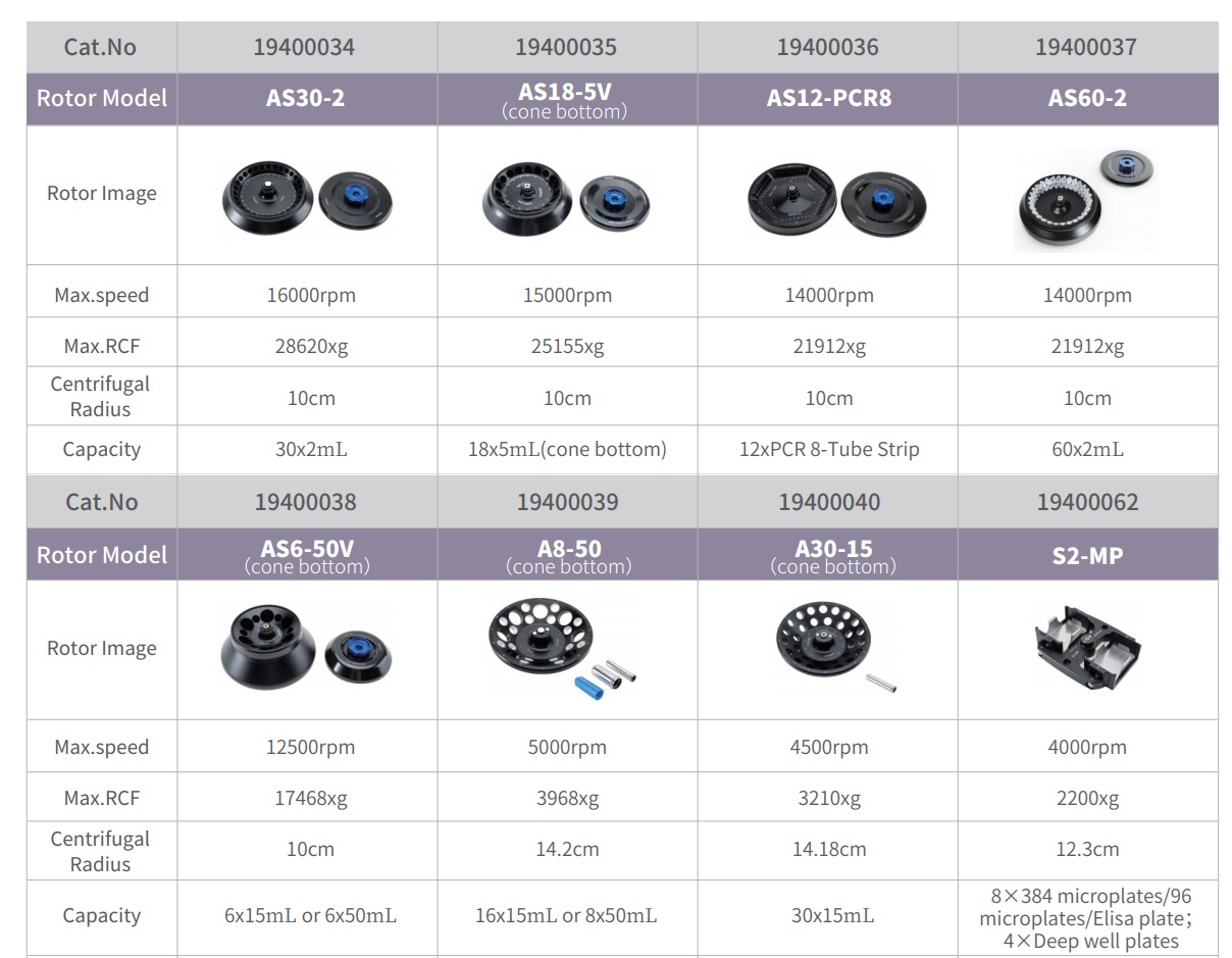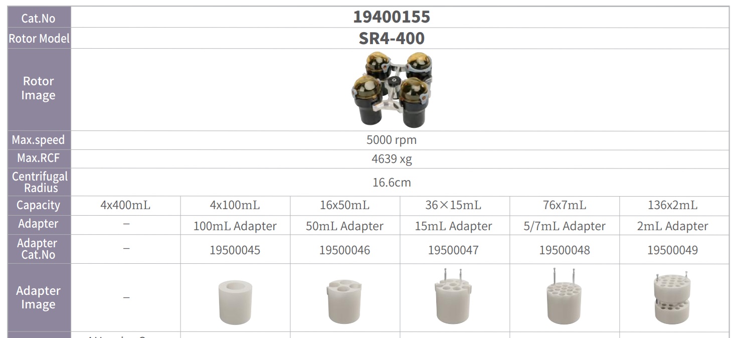 - Có nhiều tùy chọn rotor và adapter để đáp ứng các yêu cầu đa dạng của phòng thí nghiệm: hỗ trợ ly tâm các chai 400mL và 200mL; cũng tương thích với các ống 100mL, 85mL, 50mL, 15mL, 12mL, 10mL, 7mL, 5mL, 2mL và 1,5mL. Ngoài ra còn hỗ trợ ly tâm các đĩa PCR 384 giếng, đĩa vi phiến 96 giếng và ống PCR 8 dải.
