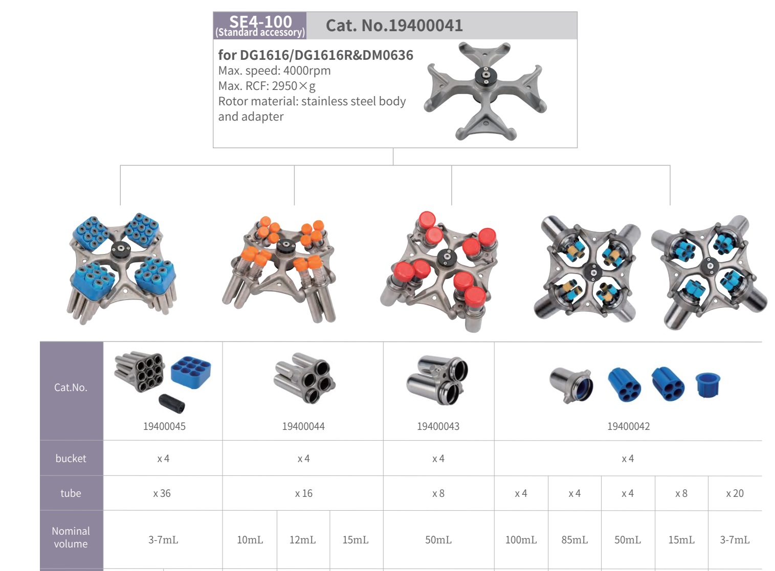 Rotor văng 4x400ml Code: SR4-400 - Tốc độ tối đa 5000 vòng/phút - Kèm theo 4 cốc (Giỏ, nắp và tay cầm) - Công suất tối đa: 4x400ml / 4 x 100ml / 16 x50ml / 36 x 15ml / 76 x 7ml / 136 x 2ml - Adapter cho 76 ống 5-7ml |